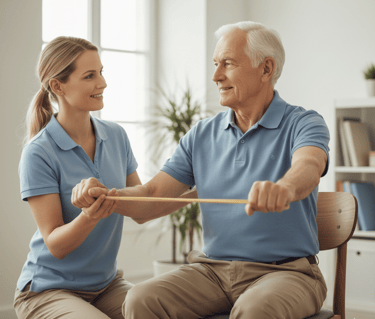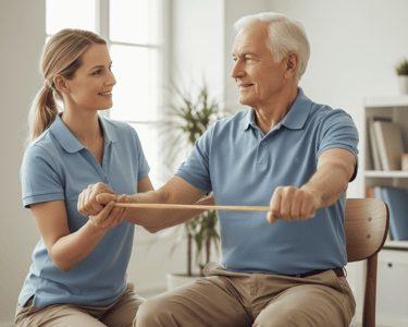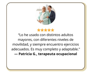 La mayoría de las actividades utilizan materiales simples que ya tienes en casa o en el consultorio: sillas, pelotas, bastones ligeros y objetos del día a día.